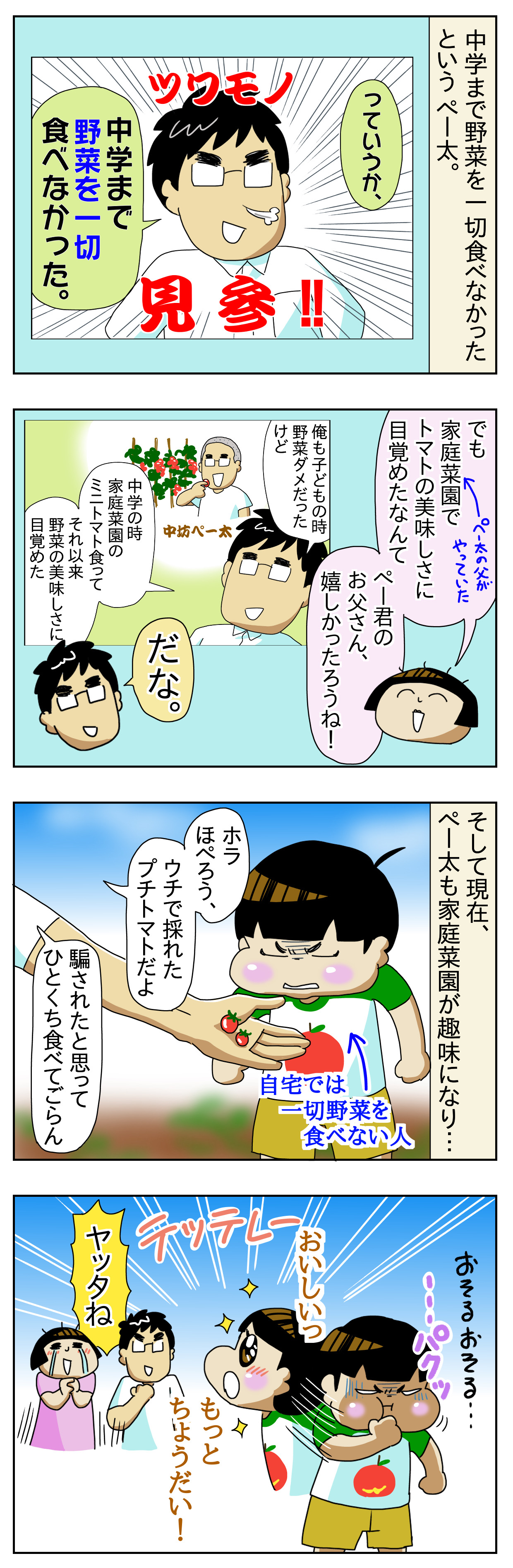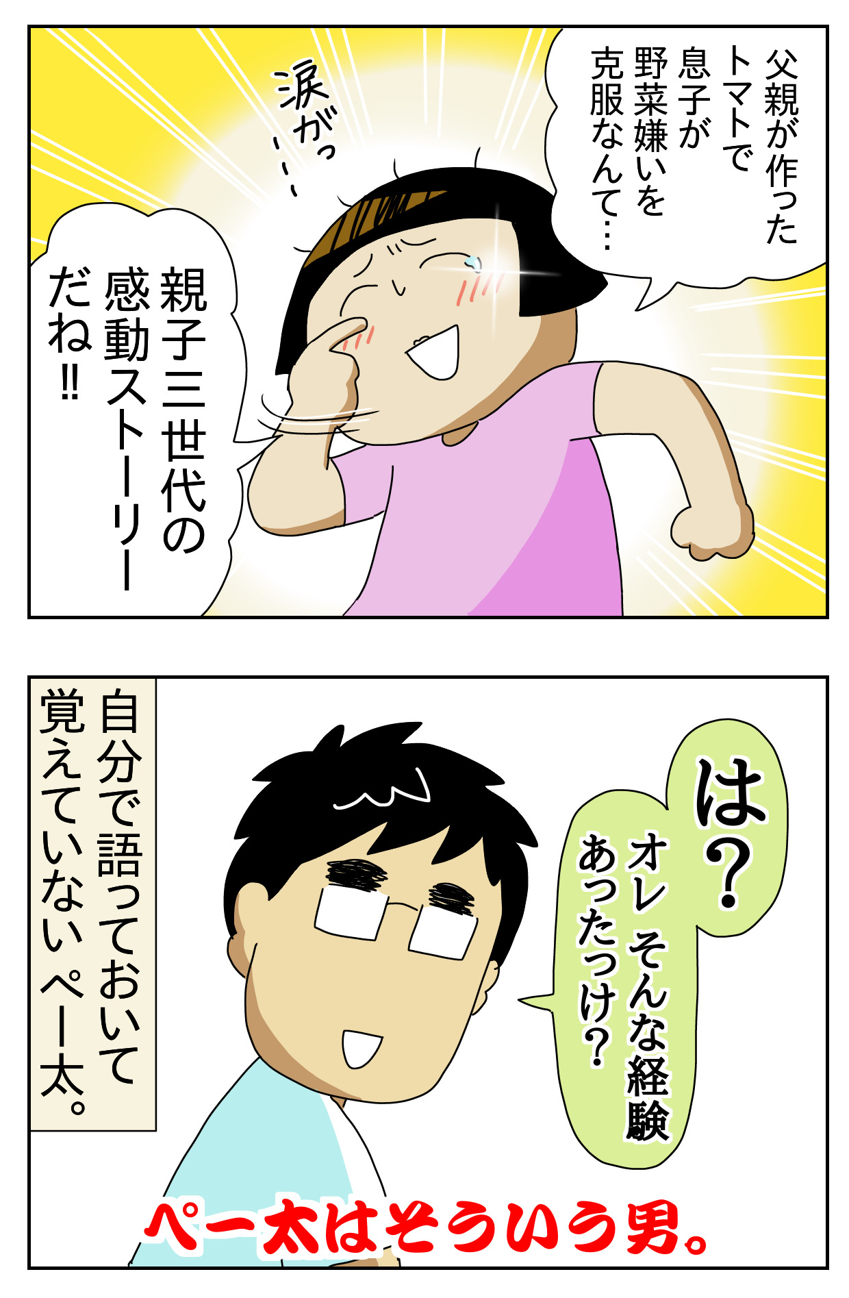 親子三世代 感動ストーリー未遂 2021年08月12日 ぺー太のお父さん、かわいそう(ToT)ぺー太もほぺろうに「そんな経験あったっけ?」って言われるがいいさ。ほぺろうは奇跡的に家庭菜園プチトマトは食べる様になりましたが、市販のトマトは相変わらず受け付けません(^_^;)↓ 親子で偏食 にほんブログ村自閉症児育児ランキング 「ぺー太」カテゴリの最新記事 < 前の記事次の記事 > コメント コメント一覧 (2) 1. みこ 2021年08月13日 09:56 ぼさこさんの心暖まる、そして楽しいマンガに癒されています。 0 ぼさ子 がしました 2. ぼさ子 2021年08月13日 16:01 >>1 みこさん、コメントありがとうございます✨✨✨ 私こそ、心暖まるお言葉を頂けて癒されています! ありがとうございます☺️🌸🌸🌸 0 ぼさ子 がしました コメントフォーム 名前 コメント 記事の評価 リセット リセット 顔 星 情報を記憶 コメントを投稿する