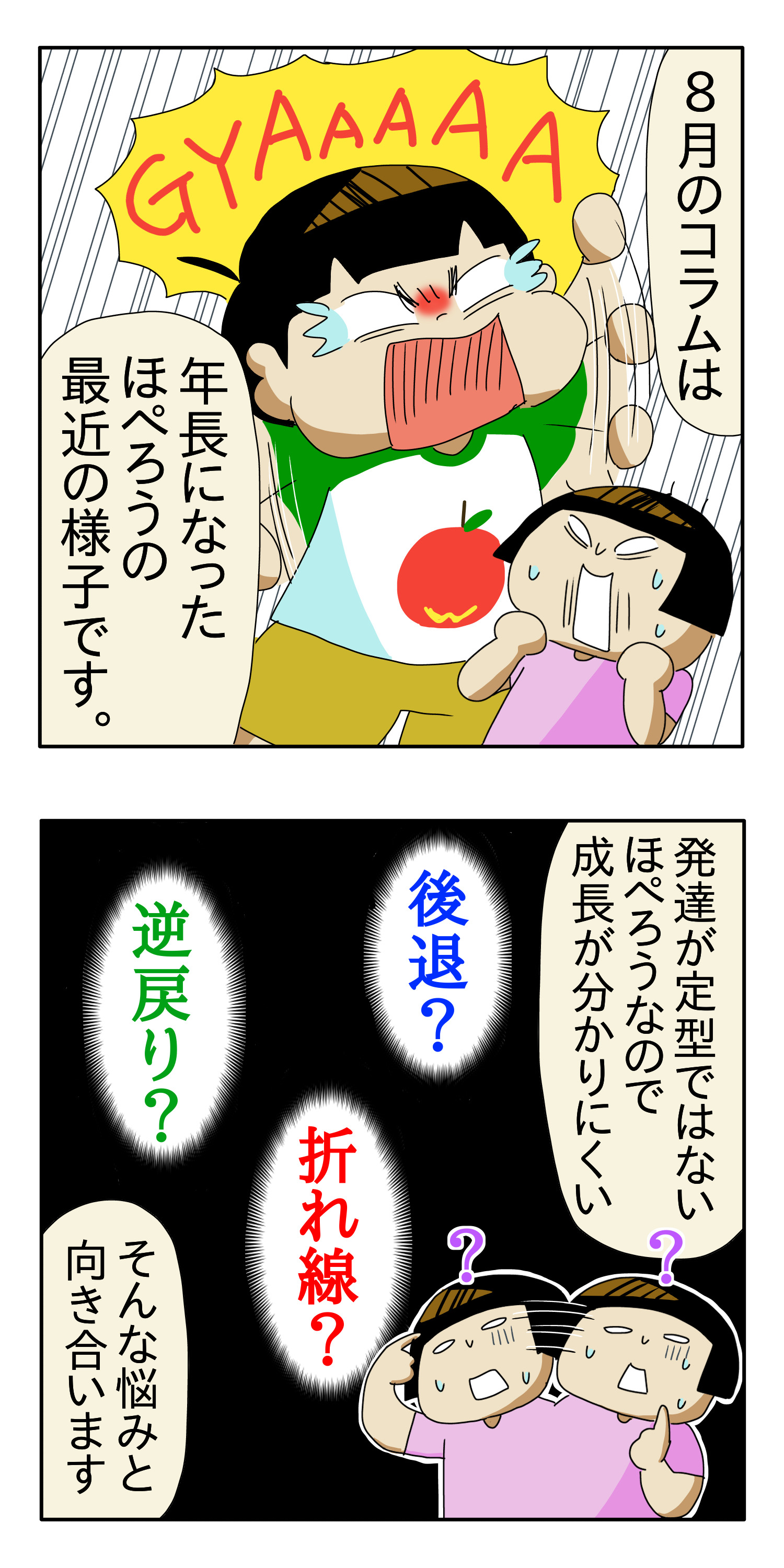 それも一緒に読んだら、確かにほぺろう君最近すごく成長していろんな事がわかるようになってきてて、自分の気持ちを伝えたいって感じてるけどやり方がわからなくて癇癪になってるのかな?と感じました。