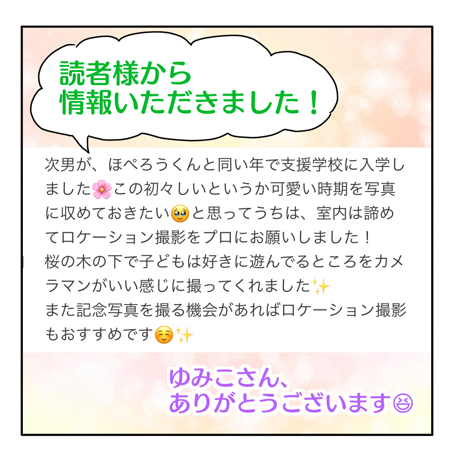 ほぺろうくん、可愛いですね💕写真を撮るって子供ながらに緊張するものだから、ご機嫌になってくれるとこちらまで嬉しくなってしまいますよね😊💕私は、この間の療育で子供の進歩があまり見られず少し落ち込んでしまい、またこのブログを覗きにきてしまいました😅