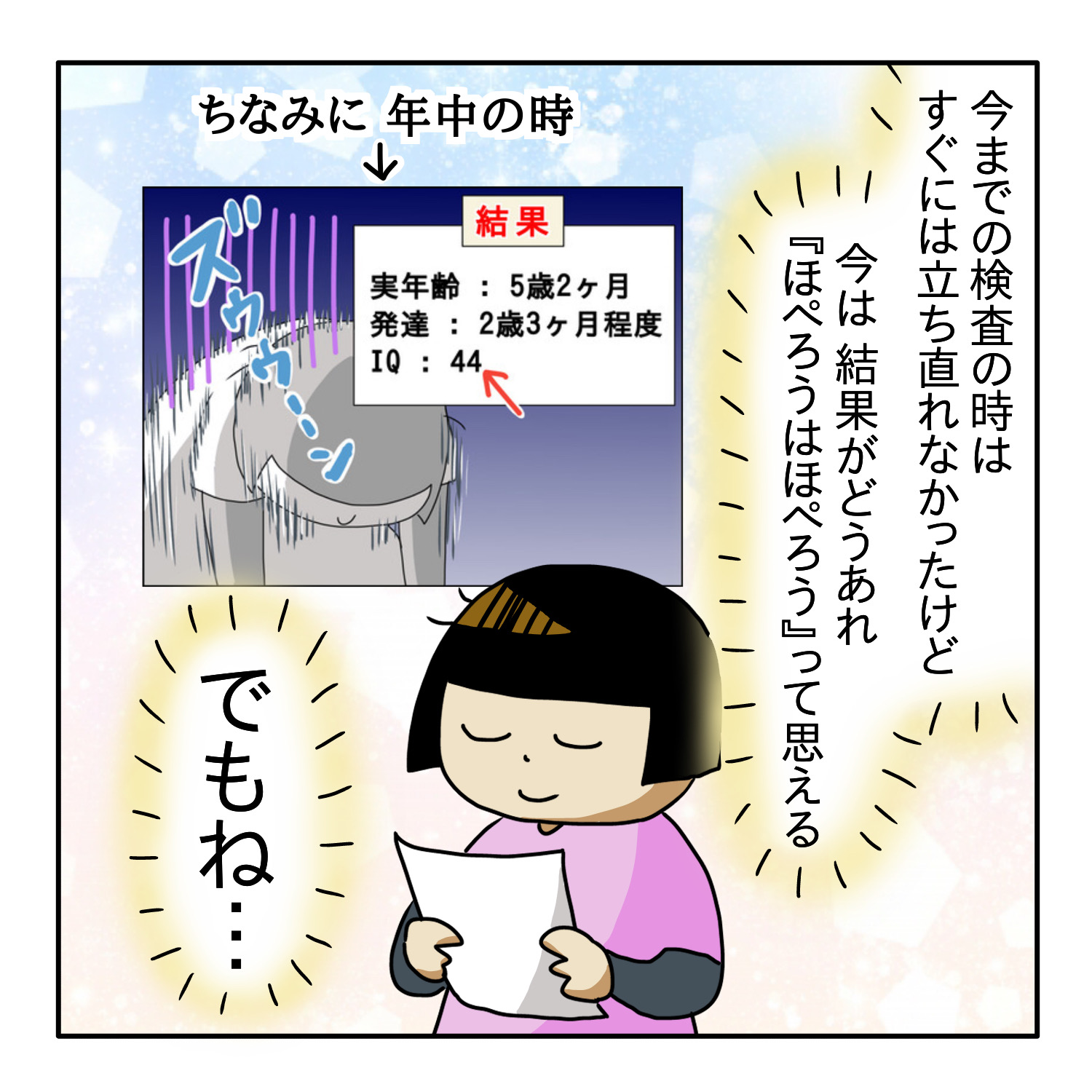 どんどん下がる発達検査6 2022年05月24日 ↓ 前回のお話 ほぺろうの今回の検査はIQ 39という結果でした。(中度ギリギリ) 第一話でも書いた通り、もっと時期を遅らせて発達検査をしていたらおそらく『重度判定』まで行っていた可能性は高いです。 とりあえず結果を聞いた瞬間は一度ションボリしますが、 医師のお話が興味深くて早めに立ち直れました(^^)(余談ですが、この時はもう学校始まってたので私一人でクリニックに来ました)↓ 続き ↓ 第一話の時 ↓ 年中時代の発達検査 にほんブログ村自閉症児育児ランキング 「自閉症息子の教育」カテゴリの最新記事 < 前の記事次の記事 > コメント コメント一覧 (10) 9. ココママ 2022年05月26日 18:34 気持ちが行ったり来たり…ほんとによくわかります‼️ こんな可愛いんだから障害があったって全然良いじゃないかって思えた次の日には何でうちの子は…って落ち込んで、まるでジェットコースターです💦笑 私は精神科に通って薬も飲んでいますが、5年経った今でも自分で自分の心がコントロールできずほとほと自分が嫌になります😭 0 ぼさ子 がしました 10. ぼさ子 2022年05月26日 21:46 >>9 ココママさん、コメントありがとうございます😭✨✨✨ もうコメント読んでて「アレ?これ私かな⁉️」って錯覚しました。 ジェットコースター…わかり過ぎる…😂😂😂 私なんて毎日が日課のように一喜一憂(←すでに座右の銘と化している)、 ジェットコースター通り越してフリーフォールです😂 自分の心をコントロール出来るのは、神様か仏様くらいさっ‼️ 0 ぼさ子 がしました 5. とらねこ 2022年05月25日 06:37 はじめまして。私の息子も今回中度の判定をもらいました。すごく凹んでなんでって受け入れらない状態です。うちの子も保育園に通っていますが、難しかったのかなとか育成室の方がよかったのかなとか色々と考えてしまっています。 0 ぼさ子 がしました 8. ぼさ子 2022年05月25日 08:42 >>5 とらねこさん、はじめまして😊✨✨✨ とらねこさんも息子さんも検査お疲れ様でした🙇♀️🍀 私なんて 息子一年生だけどいまだに一喜一憂、いろいろ悩みますよ~🤣 悩むのは我が子が大切な証拠!(←私も便乗) お互い休憩しながらユルユルと進んでいきましょ~☺️☕️🍵 0 ぼさ子 がしました 4. うきわマン 2022年05月24日 22:34 うちもです。息子は、しっかり重度になりましたが、日々の積み重ねで、できることたくさんあるし、母子の間に「言葉はいらないぜぇー 」ってくらい、分かりあえてます!!きっとこの先、学校の先生ともそんなふうになっていくんだろうなと、思います。 前回の検査では、IQ数字は教えてもらえませんでしたが、「あと少しで中度だった」とのことで、「中度に近い~重度ね♪」と、喜んでいいのか、悔しがるべきか。笑 0 ぼさ子 がしました 7. ぼさ子 2022年05月25日 07:51 >>4 「言葉はいらないぜぇー」…息子さん表情豊かなんだろうなぁ🤣💕💕💕 想像して朝っぱらからキュンキュンしてますよ💓💓💓 検査でIQが提示されると どうしても数字に振り回されますからね(メンタル的に😅) 数字を聞かない選択も、先入観に囚われずに子どもと向き合えていいかも😆💕💕💕 0 ぼさ子 がしました 3. むぎ 2022年05月24日 22:20 うちのベイビーも最近発達テストをしたのですが、中度ギリギリだったり、発達年齢が半年前より下がってたりで…「いやこれ、年齢上がっていくごとに程度も重くなるやつやん」と少しやさぐれていました🍺🍰 めちゃくちゃタイムリーな話題で有難いです…ほんとボサ子さんの漫画に救われます😭💓 障害の程度は関係ない!我が子は我が子!と思っていても、その程度を基準で考えないといけないような就学や放課後等デイサービス問題等々もあるしで、どうしましょ😂 色々と調べていく中で、北海道には療育や障害のある方を対象とした施設が多いというのを知って、将来的に移住もありなのかな…と今度見学(?)がてら北海道に遊びにいく予定です✈️ ボサ子さん、その際すれ違ったら握手してください🥺🤝← 0 ぼさ子 がしました 6. ぼさ子 2022年05月25日 07:32 >>3 やさぐれで『🍺🍰』マークがツボ過ぎる🤣🤣🤣わかる、わかる…。 そうなんですよ😂我が子は我が子!ってゆっくり受け入れてきたところで 就学やらデイやら 現実と向き合わなきゃいけない場面にブチ当たり 「おおぅ……😩💧」ってなるの いまだに繰り返してる私😂 でも回数重ねて免疫ついてきたかな??💦(←参考になってない) 北海道にそんな素敵なウワサがあるとは…どこなんだろう😳❓✨✨✨ むぎさんとすれ違った際は、私こそ握手お願いします🤣🤝💕💕 0 ぼさ子 がしました 1. ぷぷ 2022年05月24日 20:36 ウチも中度ギリギリですが、次は重度かな? とか考えて心の準備してます😮💨 点数見ると、少しオマケしてくれっ!とか思っちゃう😅 どうしてもお喋りが出来ないと、低くなっちゃいますよね💦 0 ぼさ子 がしました 2. ぼさ子 2022年05月24日 21:39 >>1 心の準備…わかる…😂😂
