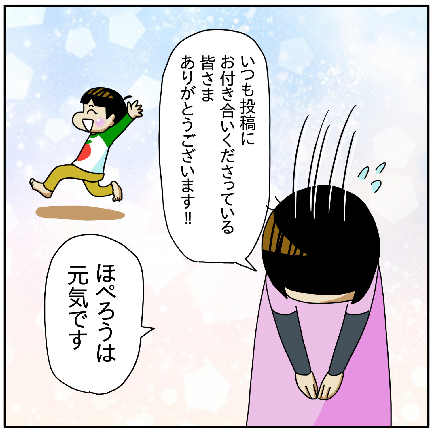 ぼさ子さんが近い障害レベルのお母さんに会って救われたと言うお話を描いておられましたが、勝手ながら私もぼさ子さんに同じ気持ちを抱いて、そして今小学生になったほぺろう君の成長を見て、うちの長男もほぺろうくんのように成長できるかも、と思えるようになりました。