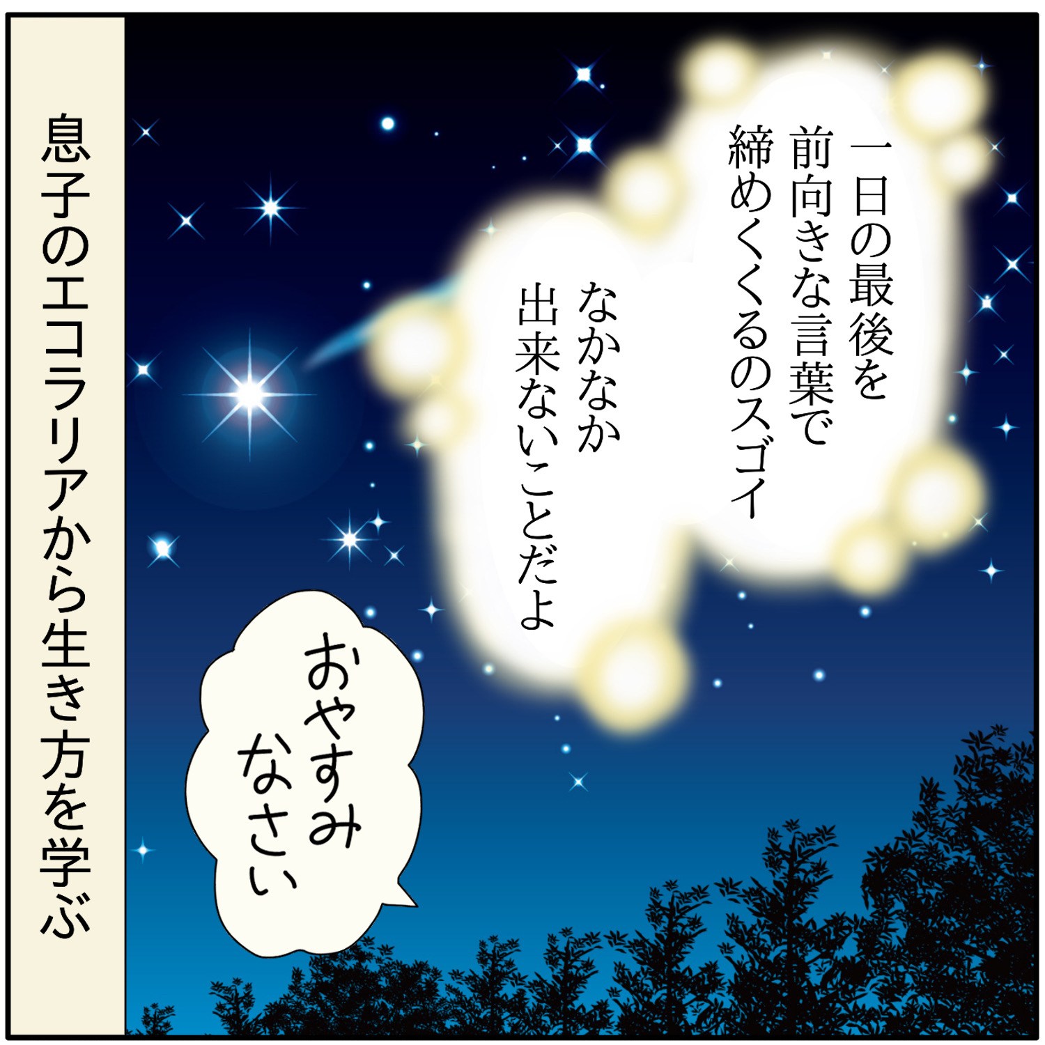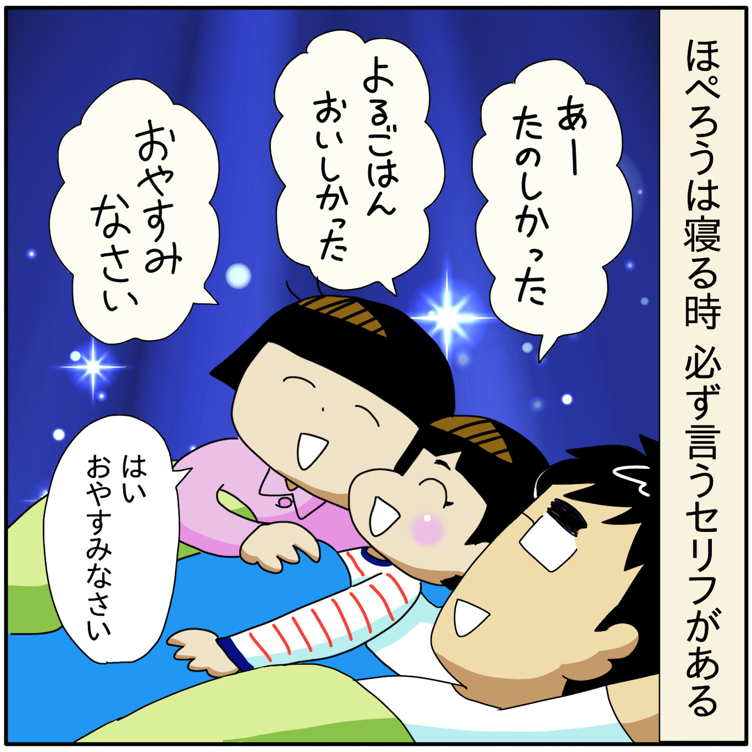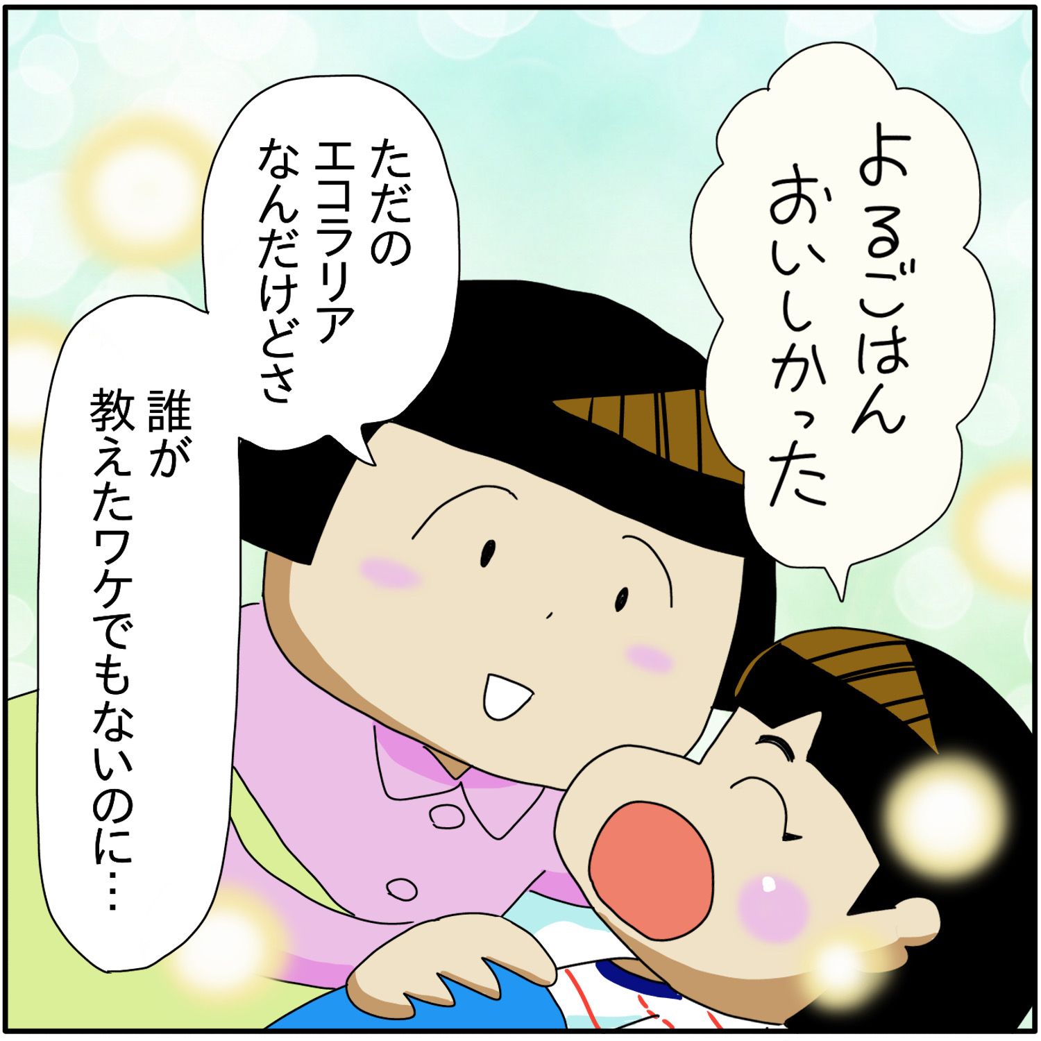 素敵なエコラリア 2024年05月23日 親もそんなこと言ってないのに…時々 ほぺろう「さん」と呼びたくなる時ある。エコラリアなのでセリフと考えが合ってるかは定かじゃないんですが、ほぺろうのおかげで親も気持ちよく眠れている。↓ 寝る時のほぺろう \ 最速で更新をお届けします /\ ランキング参加中 /更新の励みになります(^^)にほんブログ村自閉症児育児ランキング 「ほぺろう」カテゴリの最新記事 < 前の記事次の記事 > コメント コメント一覧 (8) 7. チアキ 2024年05月24日 22:00 ホントに、皆さんが言うように、ぼさ子さんとぺー太さんが素敵なことばを伝えているからだと思います!なんていい家族😭 全然関係ないですが、うちの息子は今年30歳になるので、年齢を聞かれたら「みそじです」と答えるよう、教え込もうと思いますが、どうでしょうか!? 0 ぼさ子 がしました 8. ぼさ子 2024年05月25日 06:39 >>7 チアキさんっ…!ありがとうございます😭✨ 「みそじ」いいですね👍✨ 情緒ある言葉が使えるの素敵だと思います! 0 ぼさ子 がしました 5. korin1412 2024年05月23日 23:06 そりゃあやっぱり、ご両親の素晴らしい教育の賜物!! 私なんて出るのは溜め息とおならばっかり 0 ぼさ子 がしました 6. ぼさ子 2024年05月24日 05:12 >>5 おならは私もよく出る💨笑 0 ぼさ子 がしました 2. マルクス 2024年05月23日 21:32 言葉の力ってすごいですからね‼️‼️1日の終わりに素敵な言葉…ほぺろう君…いや、ほぺろうさん‼️‼️尊すぎます‼️‼️ 0 ぼさ子 がしました 4. ぼさ子 2024年05月23日 21:39 >>2 いやホント、親の私も「ほぺろう…さん!?」ってなってます🤣‼️ 子どもってたまに大人も唸らせることしてきますよね✨ 0 ぼさ子 がしました 1. キーマカレー 2024年05月23日 20:59 ボサ子さんが素敵な声かけしてきたから、ほぺろうくんも素敵な言葉をお話しするように育っただと思います。今はエコラリアだけど、いつか素敵な意味をもった言葉に育っていくと思います。 今回の記事とは関係ないのですが、うちも夫に筋トレさせようと思います(笑) 0 ぼさ子 がしました 3. ぼさ子 2024年05月23日 21:37 >>1 ふぉぉ…そんなこと言ってくださって嬉しや嬉しや😭✨ いつかエコラリアから意味のある素敵な言葉になるように 見守っていきたいと思います! 筋トレ気に入ってくれて嬉しいですw🤣 ここだけの話ですが、実は私も腰痛予防のために筋トレ始めました~ 0 ぼさ子 がしました コメントフォーム 名前 コメント 記事の評価 リセット リセット 顔 星 情報を記憶 コメントを投稿する