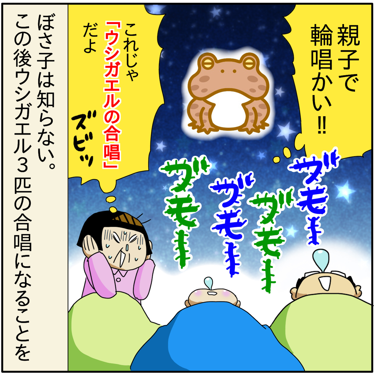 かえるの合唱 2024年12月12日 ほぺろうもペー太も普段はイビキかきませんが鼻づまりの時はウシガエルだった。家族みんな風邪ひいてたからおそらく私も…\ 最速で更新をお届けします /\ ランキング参加中 /更新の励みになります(^^)にほんブログ村自閉症児育児ランキング 「ぼさ家」カテゴリの最新記事 < 前の記事次の記事 > コメント コメント一覧 (2) 2. みぃ 2024年12月13日 19:44 以前、ほぺろう君がブランコに乗ってる記事にコメントしたみぃです。 励ましのお言葉、ありがとうございました✨ とても嬉しかったです😊 少しずつ場所見知りが和らいできてますが、来年の入園がドキドキすぎて怖いです😅 ちなみにうちの息子も、絶賛鼻風邪真っ最中で、同じウシガエル状態です笑 0 ぼさ子 がしました 3. ぼさ子 2024年12月13日 21:03 >>2 みぃさん再びコメントありがとうございます! こちらこそ嬉しいです😆✨ 息子さん鼻風邪早く治りますように!みぃさんも体を労って! 少し早いですがご入園おめでとうございます🌸🌸🌸 ドキドキして怖いの…わかる🤣 その緊張は発達っ子親の通過儀礼みたいなものなので 「ぼさ子もチビリそうなほど緊張してた」と思い出していただければ幸いです笑 0 ぼさ子 がしました コメントフォーム 名前 コメント 記事の評価 リセット リセット 顔 星 情報を記憶 コメントを投稿する