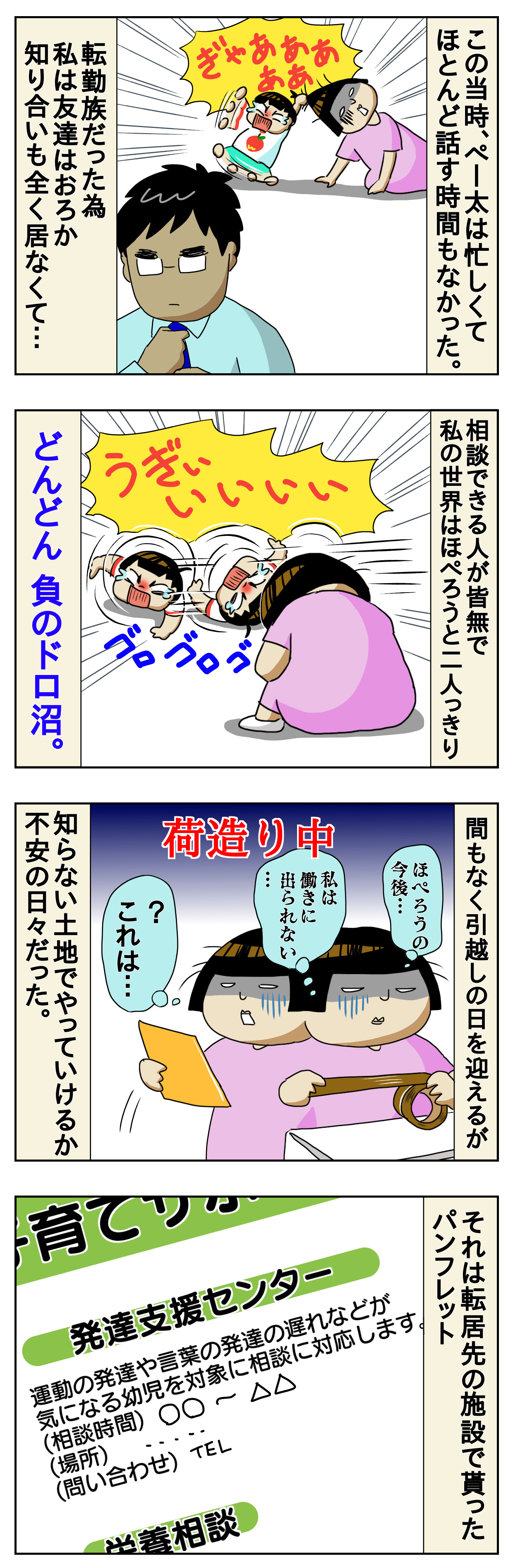 発達障害が判明するまで26 2020年10月07日 ↓ 前回のお話 26話目にしてようやく ぺー太登場。…だけど、申し訳ないことに本当に大変だった時期はぺー太に関する記憶が無いです。 頼れる人は誰もいなくて私の世界はほぺろうと二人っきり。どんどん生きてる価値が分からなくなっていく 日々でした。そんな中、引越しの準備をしていると転居先の施設で貰ったパンフレットに『発達支援センター』の表記を見つけたので、「引越し完了したらすぐに電話してみよう…」と思いました。↓ 続き ↓過去漫画もアップしてます にほんブログ村自閉症児育児ランキング 「発達障害が判明するまで」カテゴリの最新記事 < 前の記事次の記事 > コメント コメント一覧 (2) 1. 匿名 2020年10月07日 13:37 ずーっと二人きりってつらいですよね。相談できると思ったクリニックもそんな対応で😢 ぼさ子さんすごくがんばりましたね。 0 ぼさ子 がしました 2. ぼさ子 2020年10月07日 14:04 >>1 お…お優しい😭✨✨ 当時辛かった経験が、今になって成仏できました~。 0 ぼさ子 がしました コメントフォーム 名前 コメント 記事の評価 リセット リセット 顔 星 情報を記憶 コメントを投稿する