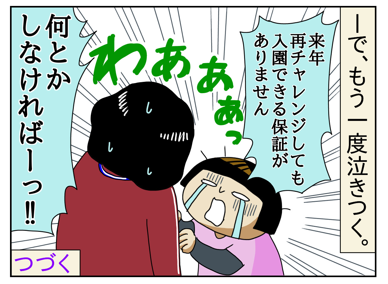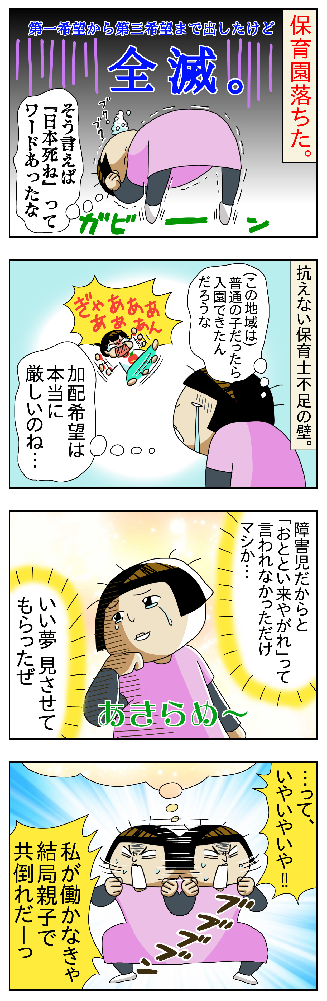ヤサグレ時代47 発達障害児の保育園探し 保育園落ちた 2021年01月27日 ↓ 前回のお話 保育園の一次募集、全滅でした。「やっぱりね…障害児が保育園なんて無理だったんだよ…」と諦めモード。でも我が家の生活の為に私は就職したかったので、またまた発達支援の先生に泣きつきました。↓ 続き ↓ 過去漫画もアップしてます にほんブログ村自閉症児育児ランキング 「障害育児に対するヤサグレ時代」カテゴリの最新記事 < 前の記事次の記事 > コメント コメントフォーム 名前 コメント 記事の評価 リセット リセット 顔 星 情報を記憶 コメントを投稿する