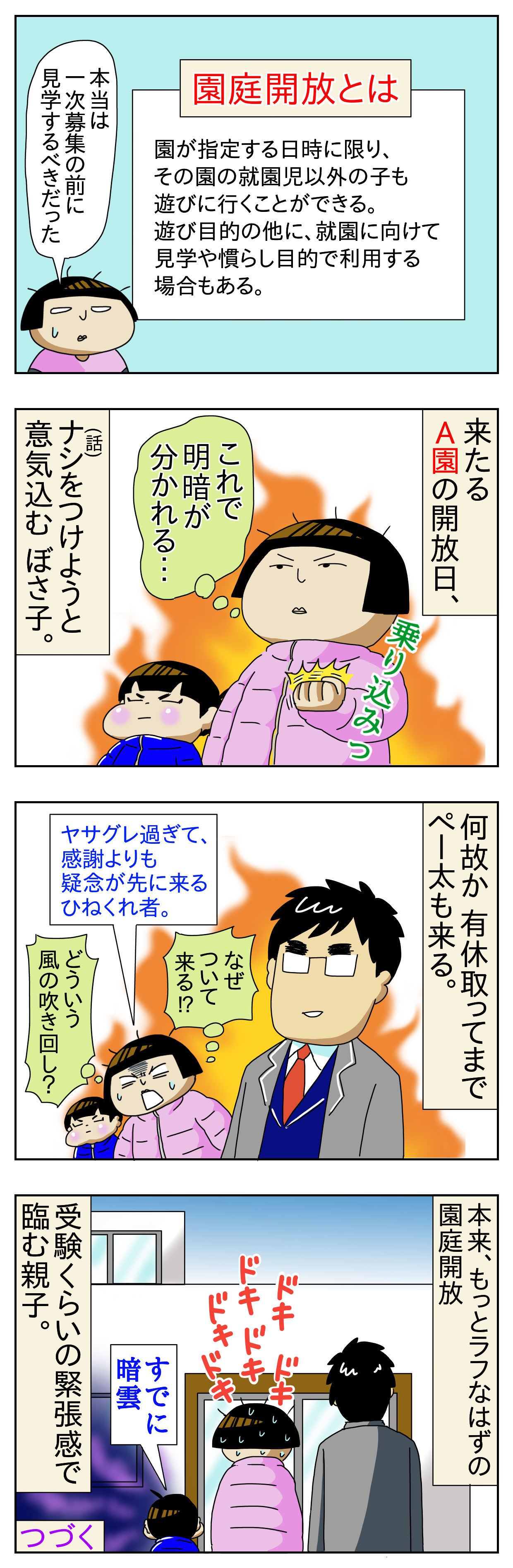 ヤサグレ時代49 発達障害児の保育園探し 園庭開放訪問 2021年01月31日 ↓ 前回のお話 『園庭開放に遊びに行ってそのついでに園長先生とお話しする…』くらいの気持ちで臨もうと思ったのですが、今後の人生を決めるお受験くらい緊張しました。ぺー太が有休取ってまでついてきたのは想定外。(しかも割とキチンとした格好だった)きっと 保育園の先生も「なんか 気合入った親子が来たなー」って思ったことでしょう。↓ 続き ↓ 過去漫画もアップしてます にほんブログ村自閉症児育児ランキング 「障害育児に対するヤサグレ時代」カテゴリの最新記事 < 前の記事次の記事 > コメント コメント一覧 (2) 1. 蛇口浩敬 2023年03月13日 21:16 岩田彦助 0 ぼさ子 がしました 2. ぼさ子 2023年03月14日 06:32 >>1 😄 0 ぼさ子 がしました コメントフォーム 名前 コメント 記事の評価 リセット リセット 顔 星 情報を記憶 コメントを投稿する