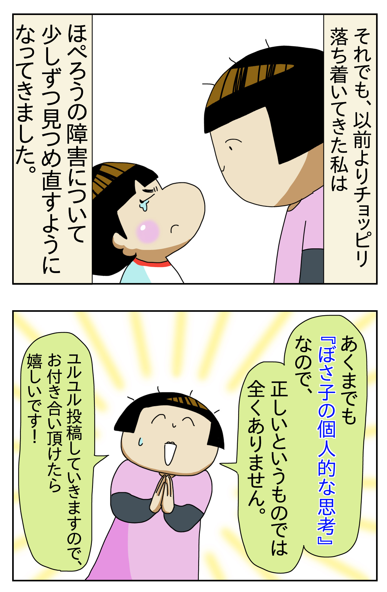 障害育児に対する心境の変化~プロローグ~ 2021年05月27日 以前投稿していた『ヤサグレ時代』の続編です。↓ ヤサグレ時代のその後から現在に至るまでの心境の変化を綴っていきたいと思います。本当に『ぼさ子なりの考え方』なので、ユル~く受け止めて頂けたら幸いです(^^)↓ 続き ↓ 『死』まで考えてたドン底時代 ↓ 『ヤサグレ時代 68』 ↓ 過去漫画もアップしてます にほんブログ村自閉症児育児ランキング 「障害育児に対する心境の変化」カテゴリの最新記事 < 前の記事次の記事 > コメント コメント一覧 (4) 3. 布団虫 2024年09月20日 12:27 障害児を育てるママは必ず、検索魔→ヤサグレる→どん底まで落ち込む→ちょっと冷静になる→子供を可愛いと思うと変化していくのかな、と皆さんのコメントを読んで思いました。 私は義父母から、「療育辞めろ、専門の先生たちはペテン師、母親が悪い」など辛辣に言われ、寝不足もあり、死んだら楽になるのかな、とふと思ってしまいました。幼馴染姉妹、保育士をしている同級生に、連絡して、それぞれ話を聞いてもらい、冷静になりました。 公認心理師の先生から、息子が3歳の頃に、発達がゆっくりだとハッキリ言われて、「義父母は先に無くなるから、責任は持ってくれません」と言われ、「母親である、私がしっかりと息子の今後を考える、決めて行かないと」と決意し、義父が口出しをしても、色々細かい息子の情報は伝えず、夫と相談してよくかんがえ、義父母に報告。わかりやすく伝え、理解を促しました。 多動が酷かったので、義父母には療育の送迎は手伝ってもらっていたので、私が受け身になっていた事にもその頃気づくことができました。 それからは、今思うと、ギアが入ったというのか、 息子の症状への理解も深まり、真正面から受け止められたんだと思います。 息子が年長になり、同じクラスのママから相談を受けました。この私がアドバイスをしているなんて、 と驚いてましたが、悩みながらもやってきたんだな、 と改めて思いました。 やはり、寝不足は1番だめですね。そういう時は 悪いことしか、考えられません。 ボサ子さんの言うように、自分を甘やかしましょう。 皆んな頑張っている。 0 ぼさ子 がしました 4. ぼさ子 2024年09月20日 17:23 >>3 皆んな頑張っている。 布団虫さん素敵なコメントをありがとうございます!! 0 ぼさ子 がしました 1. お気持ちわかります。 2021年05月28日 11:48 うちの小学校卒業間近でニ次障害を起こしたから病院に繋がりASDであることがわかりました。 その時は息子はもう悪魔のようで私は毎日死にたいと思っていました。 今は積極的に死にたいとは思いませんがもし余命宣告をされたらちょっとホッとするかも…という気持ちがあるのも事実です。 ゴールが見えるからです。 息子を見守りたいという気持ちとともに楽になりたいという思いも心の隅にいつもあります。 暗い話でごめんなさいね。 0 ぼさ子 がしました 2. ぼさ子 2021年05月28日 13:06 >>1 コメントありがとうございます😆✨✨✨ 私は「ほぺろうが死んでも後悔しないかも…」と口に出した事あります。そして夫に失望され、その時は『こんな酷い私は死んだ方がみんな幸せ』とすら思っていました😢 今でも息子の将来に希望があるかなんてわかりません。「大人になった方が大変になるよ」と言われる事もあります。 だけど自分の経験が、未来の誰かの『一人じゃない』に繋がったらいいな~と願っています😊🍀 今 何か出来るとしたら、お互い頑張って自分を甘やかしましょ✌🏻‼️✨✨✨ 0 ぼさ子 がしました コメントフォーム 名前 コメント 記事の評価 リセット リセット 顔 星 情報を記憶 コメントを投稿する