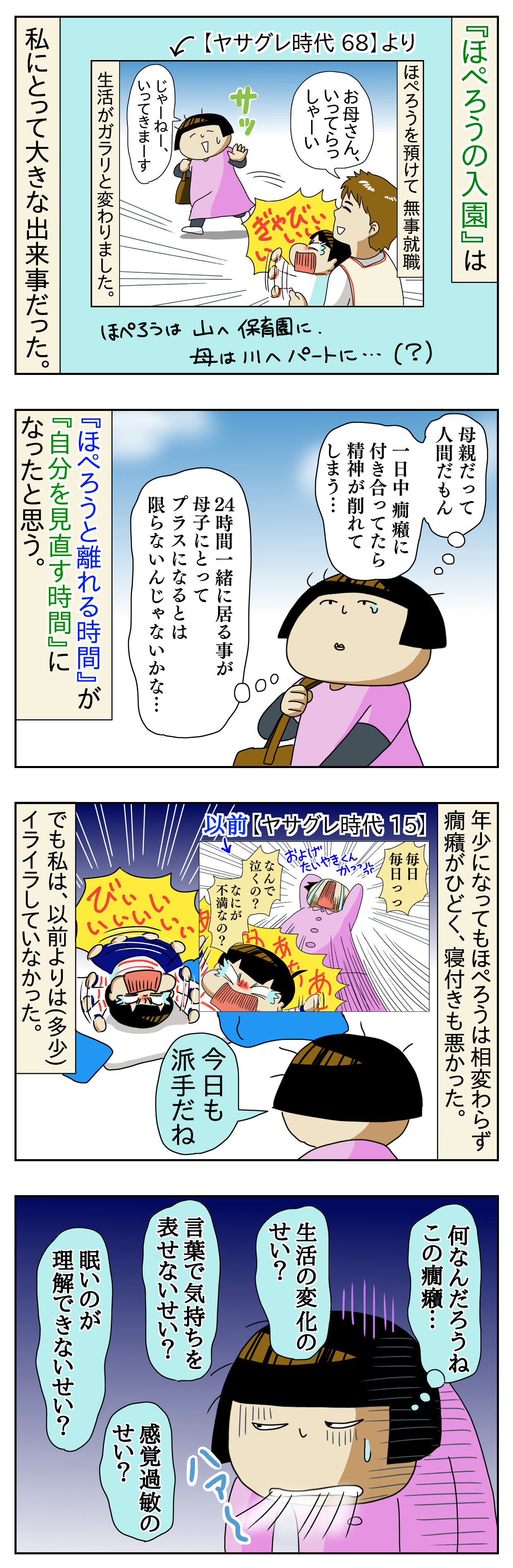 障害育児に対する心境の変化1 2021年05月28日 ↓ 前回のお話 *ほぺろう3歳頃のお話です。保育園に入園できたものの、この頃はまだ癇癪がひどかったほぺろう。でも、ほぺろうと離れる時間を作れたおかげで母の方が少しずつ変わっていけた気がします。↓ 続き ↓ 寝付きもひどかったほぺろう ↓ ヤサグレ時代68 ↓ 過去漫画もアップしてます にほんブログ村自閉症児育児ランキング 「障害育児に対する心境の変化」カテゴリの最新記事 < 前の記事次の記事 > コメント コメント一覧 (2) 1. くまごろう 2021年05月28日 19:49 こんばんは! 私は少し前から神経症になってしまい、薬をもらったのですが、副作用で何て言ったらいいかわからない不安感があって旦那さんに伝えるのが難しく、 その時、息子も話せないからこういうもどかしい思いを沢山しているんだろうなあ(;_;)と癇癪に対する接し方を変えることができました^ ^ 大変だけど、息子にはたくさんの事を教えてもらいます^ ^ 0 ぼさ子 がしました 2. ぼさ子 2021年05月28日 20:46 >>1 くまごろうさん こんばんはです!😄🌙 神経症…なかなか他人には伝わらない辛さですよね😢 でもそんな苦労を息子さんへの気付きに変えられるなんて凄いです。 くまごろうさんの息子さんへの想いと言うか、優しさの強さなんだと思います☺️✨✨ 0 ぼさ子 がしました コメントフォーム 名前 コメント 記事の評価 リセット リセット 顔 星 情報を記憶 コメントを投稿する