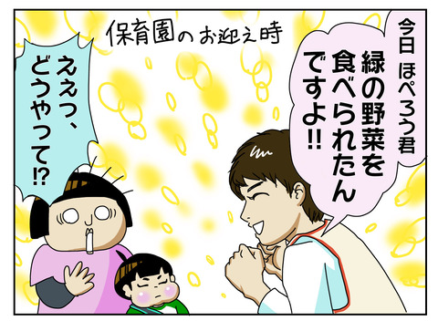 偏食克服の一筋の光明 ほぺろうは食べられる食材が少なく緑の野菜は一切受け付けません。↓参照ほぺろうの偏食事情偏食事情ほぺろう4歳覚え書き息子のひどい偏食に対して開き直れた理由そんな ほぺろうですが保育園では時々緑の野菜を食べているそうなんです。(年中さんに進級する少し前の話)ほぺ ... 2020年06月26日 続きを読む